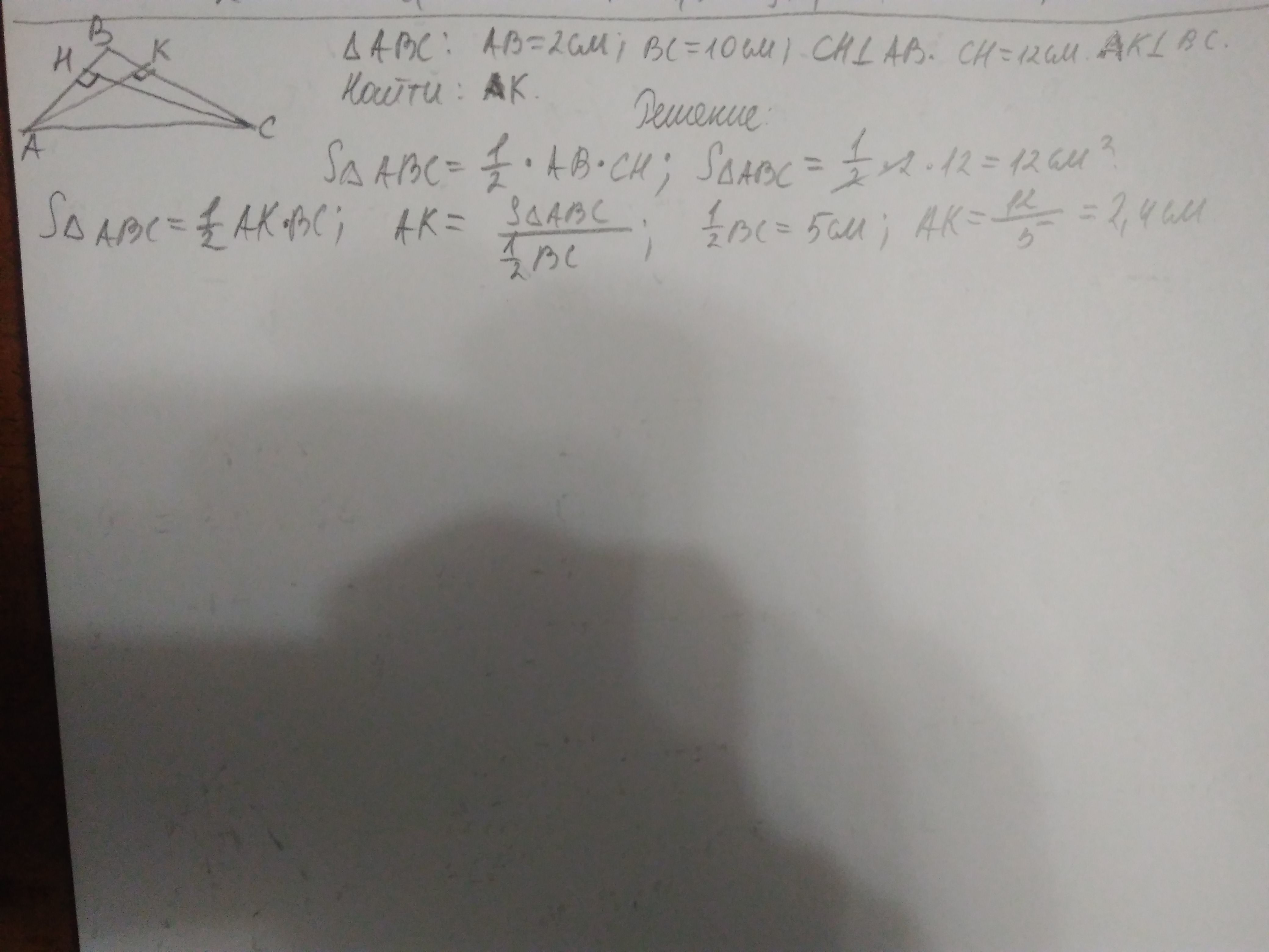 Стороны треугольника 2 см и 10 см. Высота проведённая к меньшей стороне равна 12 см. Найти высоту проведённую к большей стороне.