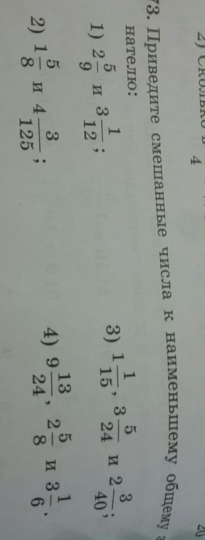 5/9=20/36 1/12=2/36 2)5/8=625/1000 3/125=24/1000 3)1/15=8/120 5/24=25/120 3/40=15/120 4)13/24 5/8=15/24 1/6=4/24