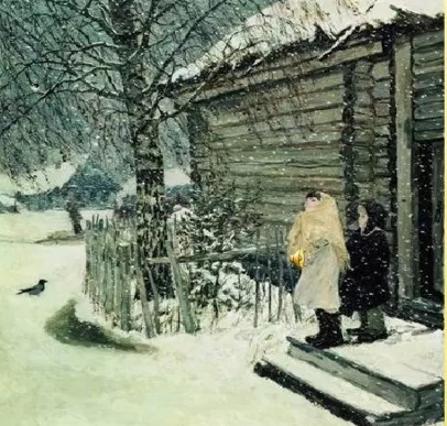 На заднем плане мы видим широкую деревенскую улицу, покрытую белоснежным ковром, и еще одну фигуру человека, который идет по своим делам или тоже вышел насладиться первым снегопадом.