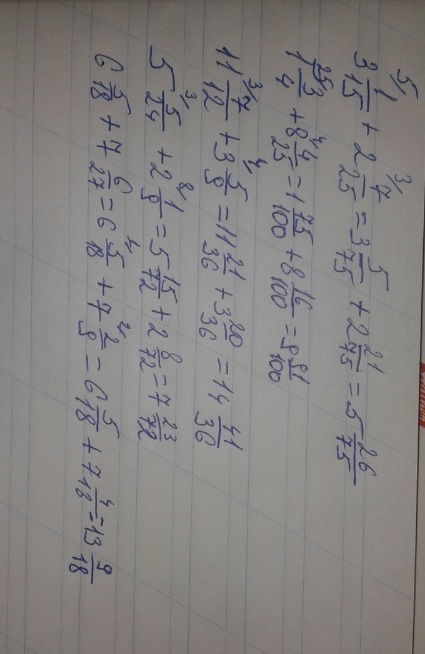 выполнить сложение:3целых 1/15+2целых 7/25; 1 3/4+8 4/25; 11 7/12+3 5/9; 5 5/24+2 1/9; 6 5/18+7 6/27