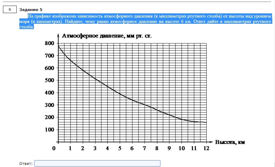 На графике изображена зависимость атмосферного давления (в миллиметрах ртутного столба) от высоты над уровнем моря (в километрах). Найдите, чему равно атмосферное давление на высоте 6 км. Ответ дайте в миллиметрах ртутного столба.