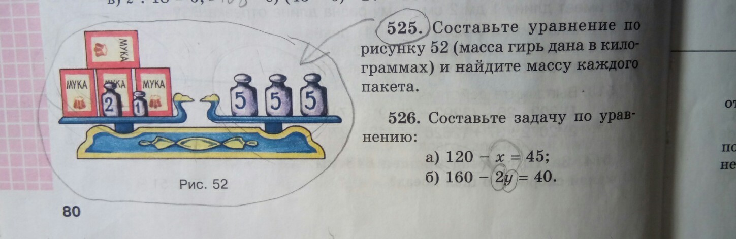 Масса всех 3-х гирь равна 1. Далее за x возьмем массу 1 пакета муки. Т.к. есль 4 пакета то будет 4x масса пакетов. Сосьавляем уравнение