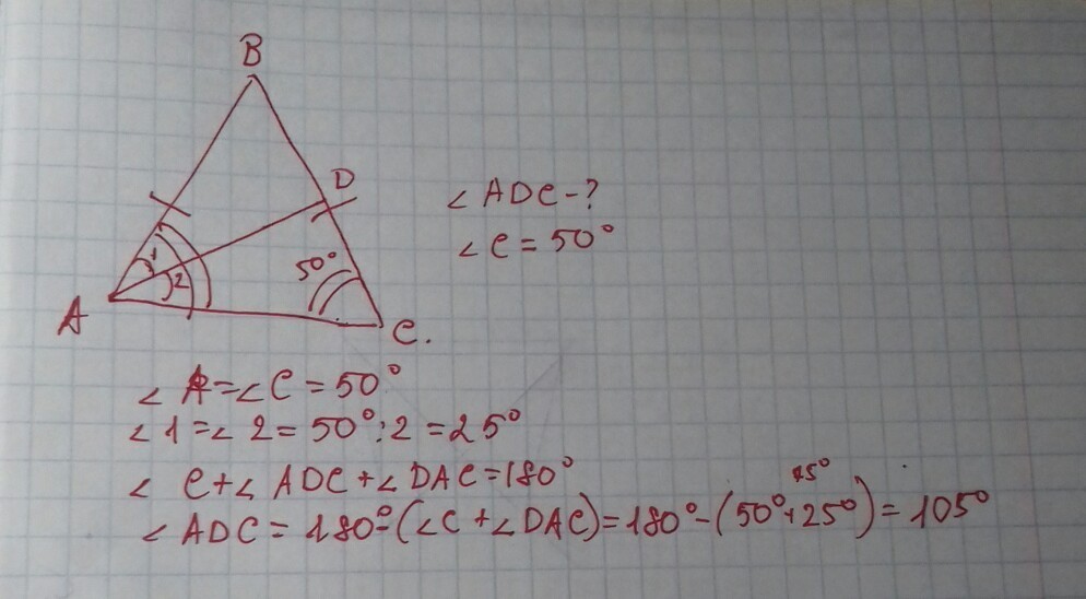 В равнобедренном треугольнике АВС с основанием АС проведена биссектриса АD.Найдите угол АDC,если угол С равен 50 градусов