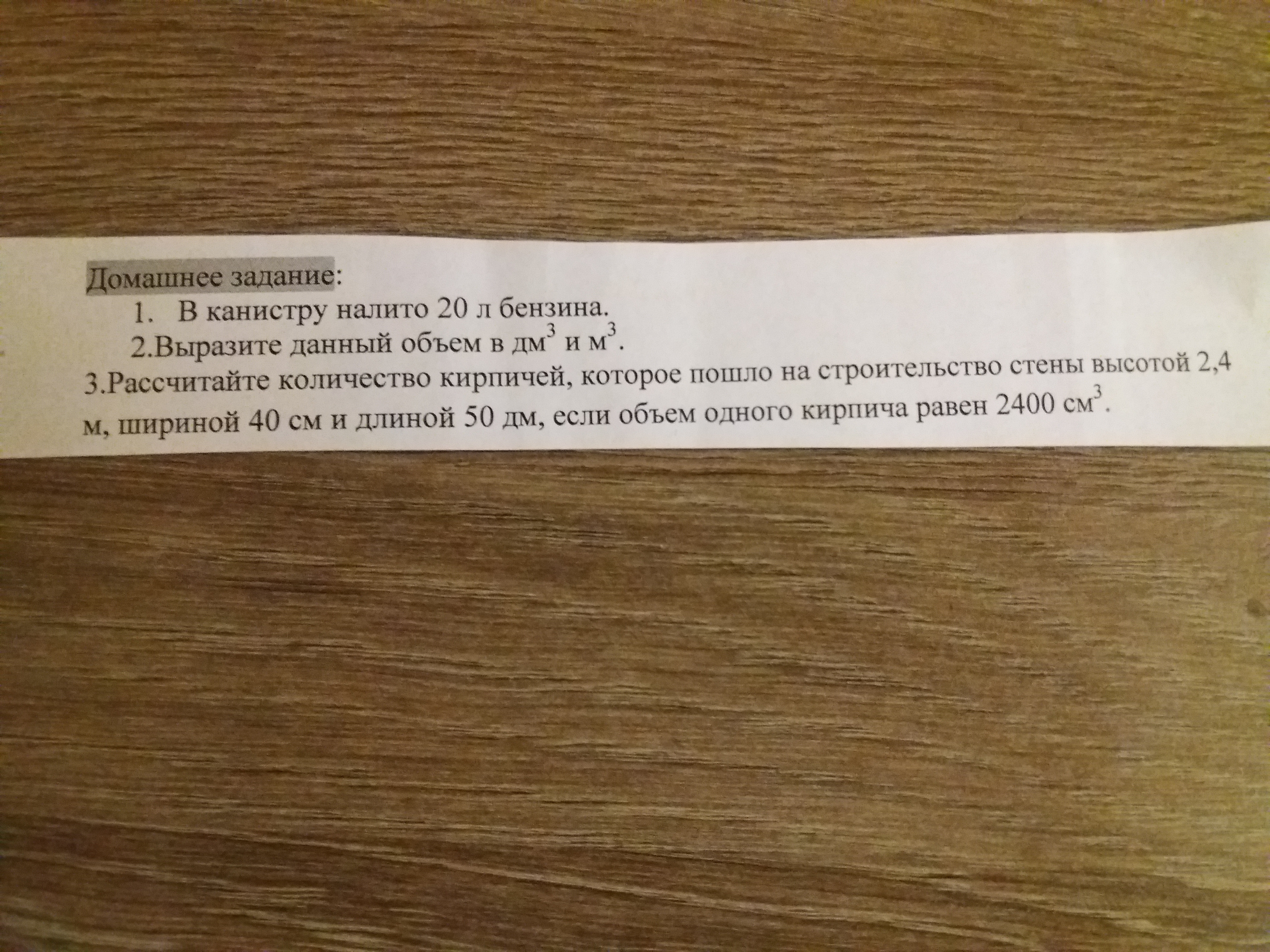 3. Рассчитайте количество кирпечей, которое пошло на строительство стены высотой 2,4м,шириной 40 см и длиной 50 дм, если объем одногокирпича равен 2400 см3 (кубических)