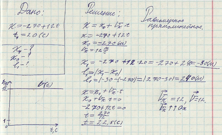 Движение грузового автомобиля описывается уравнением х = -270 + 12t. Опишите характер движения автомобиля, Найдите начальную координату, модуль и направление вектора скорости, координату и перемещение автомобиля за 20 с. Когда автомобиль пройдет через начало координат? Постройте график зависимости x(t) и u(t)