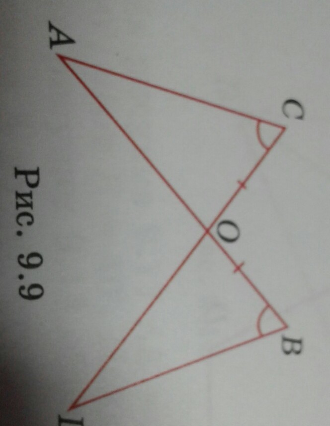 На рисунке 9.9 отрезки AB и CD пересикаются в точке О, ОB=ОС и угол В равен углу С.Докажите равенство треугольников АОС=DOB