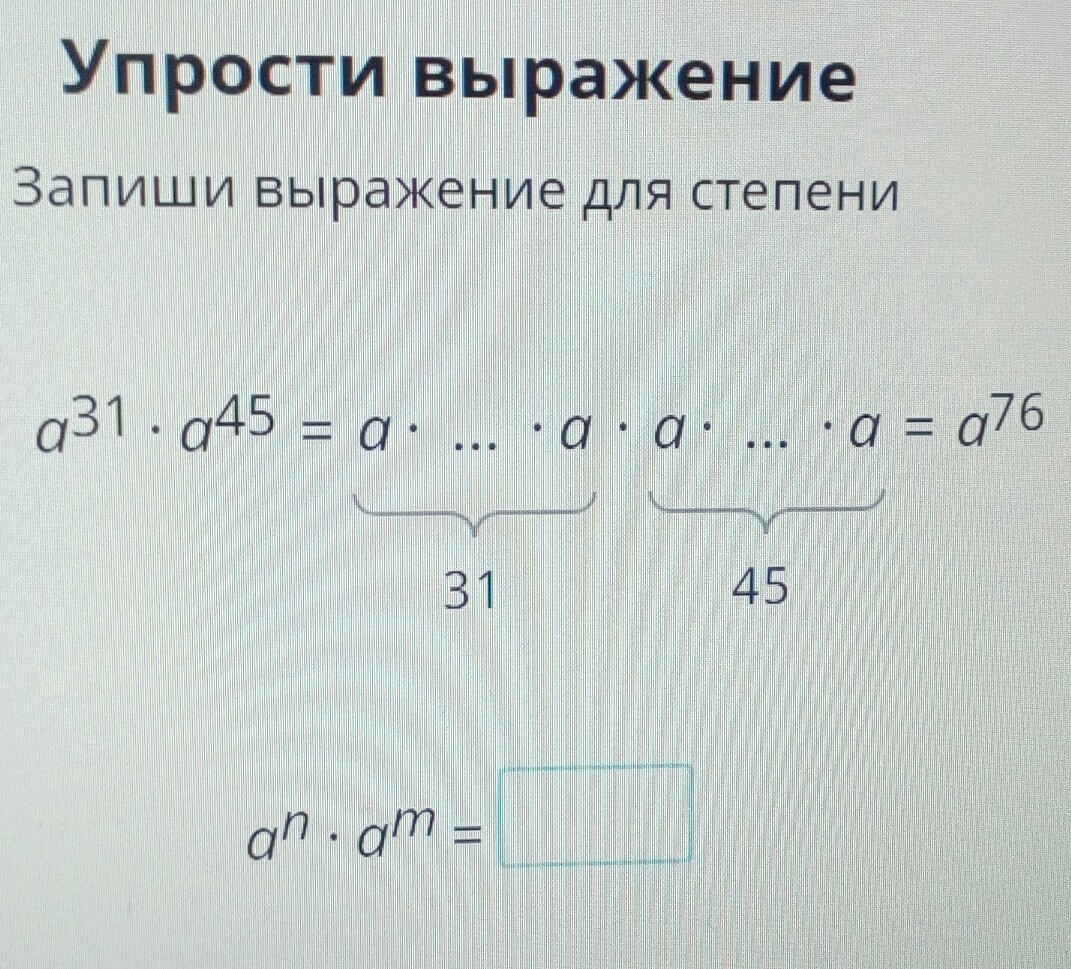 а при умножении число остаётся, в нашем случае - это (а), а степени слаживаются, то есть 31+45=76 - эти числа всё степени!!!!!!!