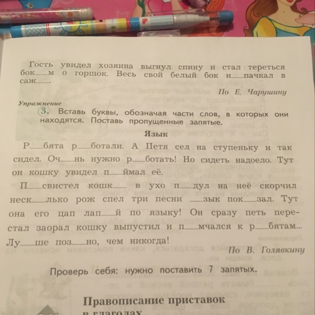 Ребята работали.Но сидеть надоело.А Петя сел на ступеньку и так сидел. Очень нужно работать! Тут он кошку увидел ,поймал её.