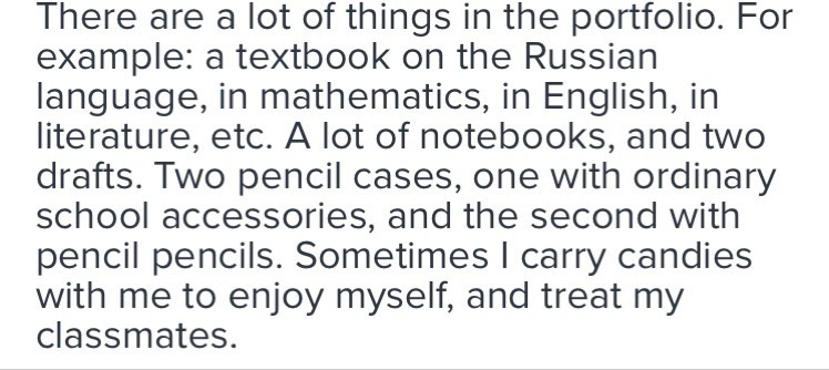 Зей ар ( р слабая, почти не произносится) э лот оф зинкс ин зе портфолио. Фор иксемпл : э текстбук он зе Рашн ланджуидж ин матматикс ин инглиш литератэр ит. Э лот оф нотбукс энд ту дрэфтс . Ту пенсил кэйсес уан уиз ординэри скул экессориес энд зе сэконд уиз пенсил пенсилс. Сомтаймс ай кэрри кандез уиз ми ту энджой маселф энд трит май клэсмэтс.