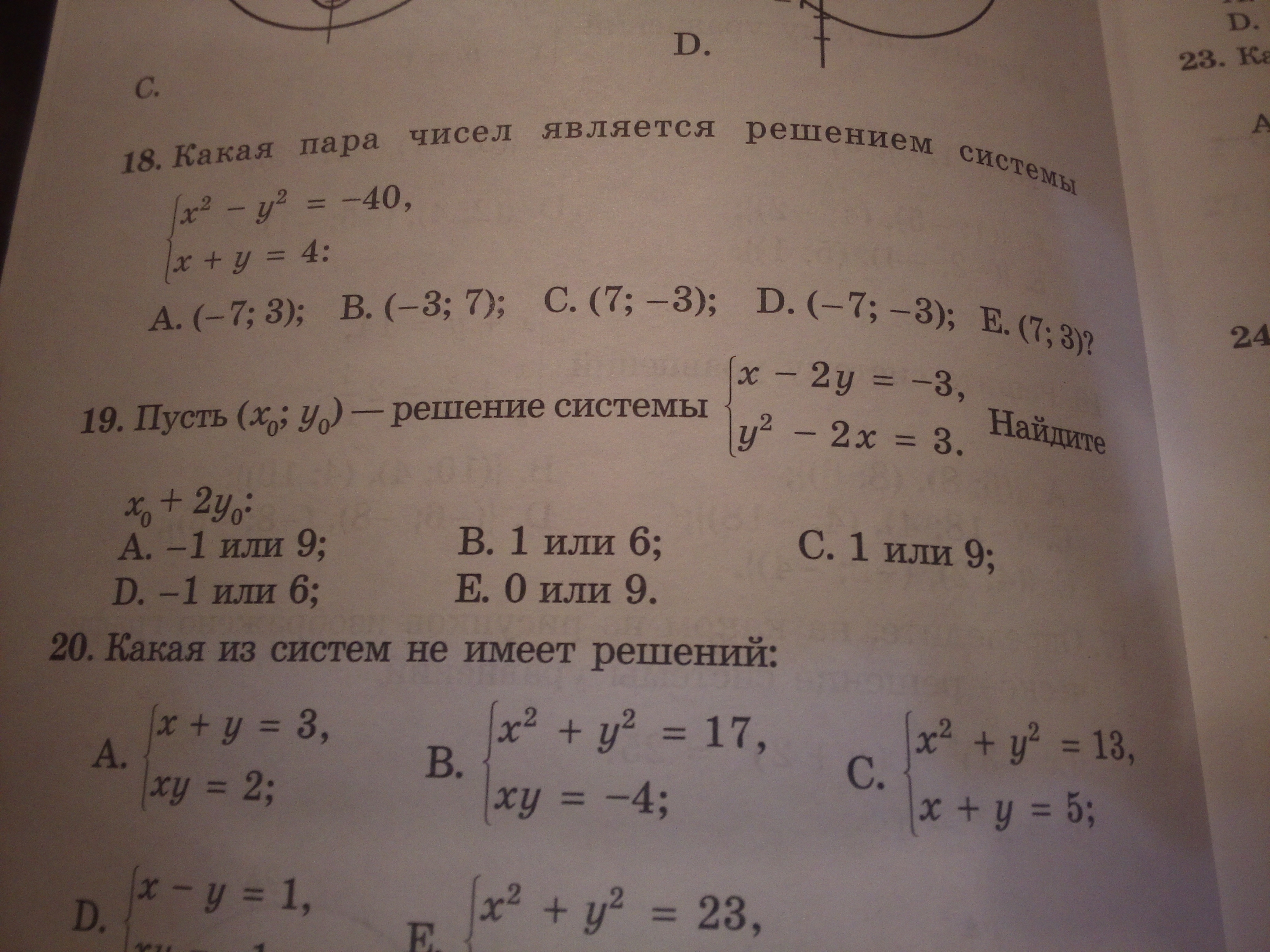 19 вопрос, у меня получилось, что решением являются точки (-1;3) и (3;1), но при подстановке в выражение x+2y ни один из ответов не получается