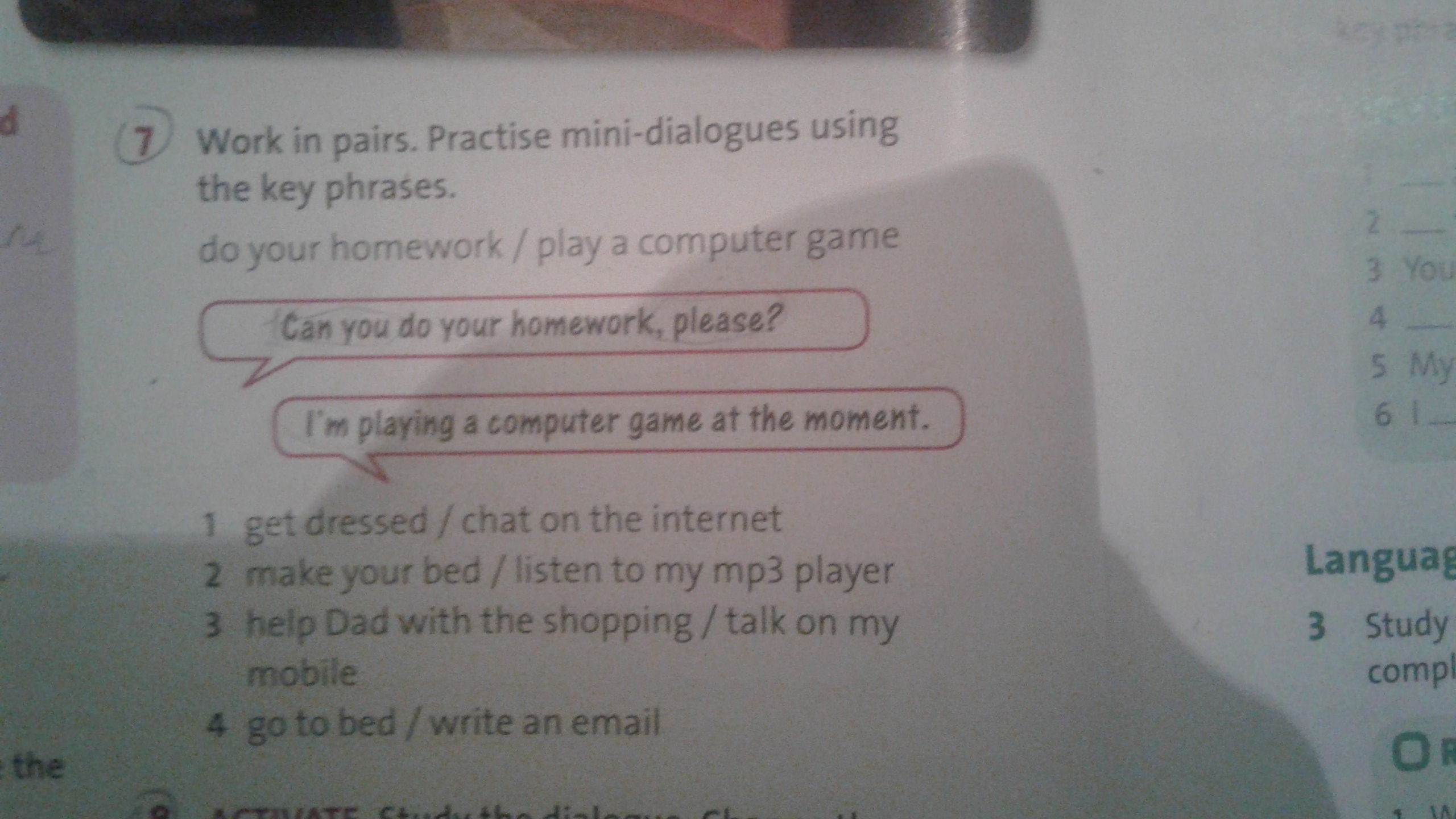 1)do you get dressed ? i'm chatting on the internet 2)did you make your bed? i'm listening to my mp3 player 3) can you help Dad with the shopping please? i'm talking on my mobile 4) are you going to bed? i'm writing an email