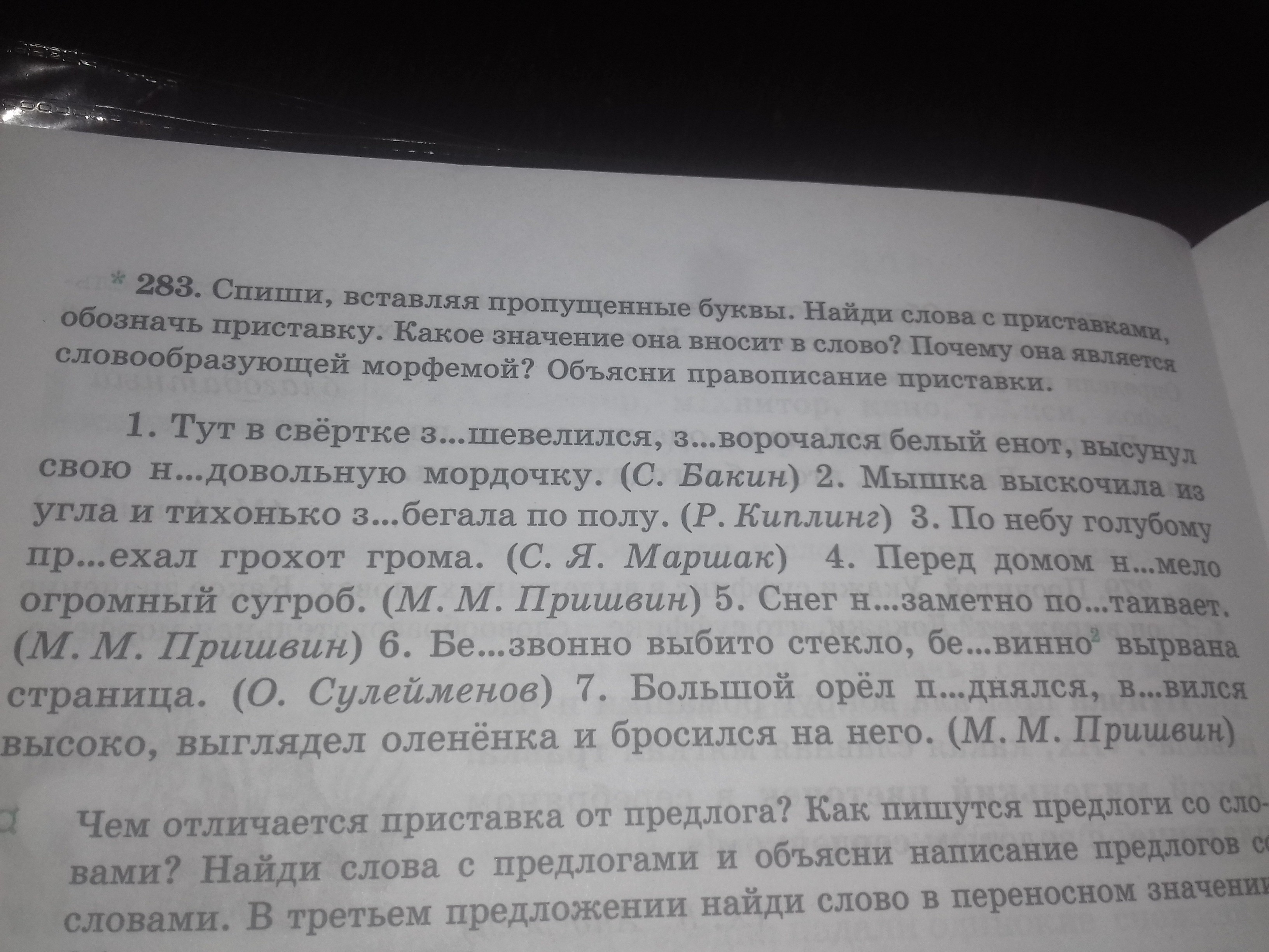 Тут в свёртке зашевелился,заворочался белый енот,высунул свою недовольную мордочку.Мышка выскочила из угла и тихонько забегала по полу.По небу голубому проехал грохот грома.Перед домом намело огромный сугроб.Снег незаметно подтаивает. Беззвонно выбито стекло,безвинно вырвана страница.Большой орёл поднялся,взвился высоко,выглядел оленёнка и бросился на него.Слова с приставками:зашевелился,зоворочался,недовольную,забегала,незаметно,подтаивает,беззвонно,безвинно.