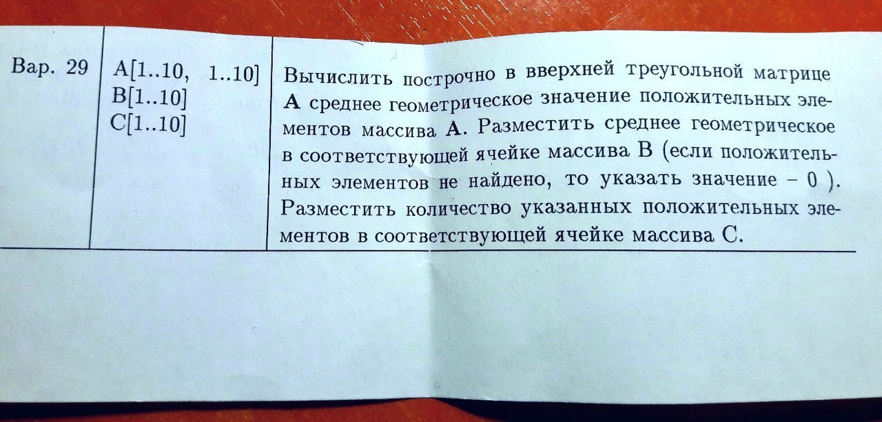 Вычислить построчно в верхней треугольной матрице A среднее геометрическое значение положительных элементов массива A.