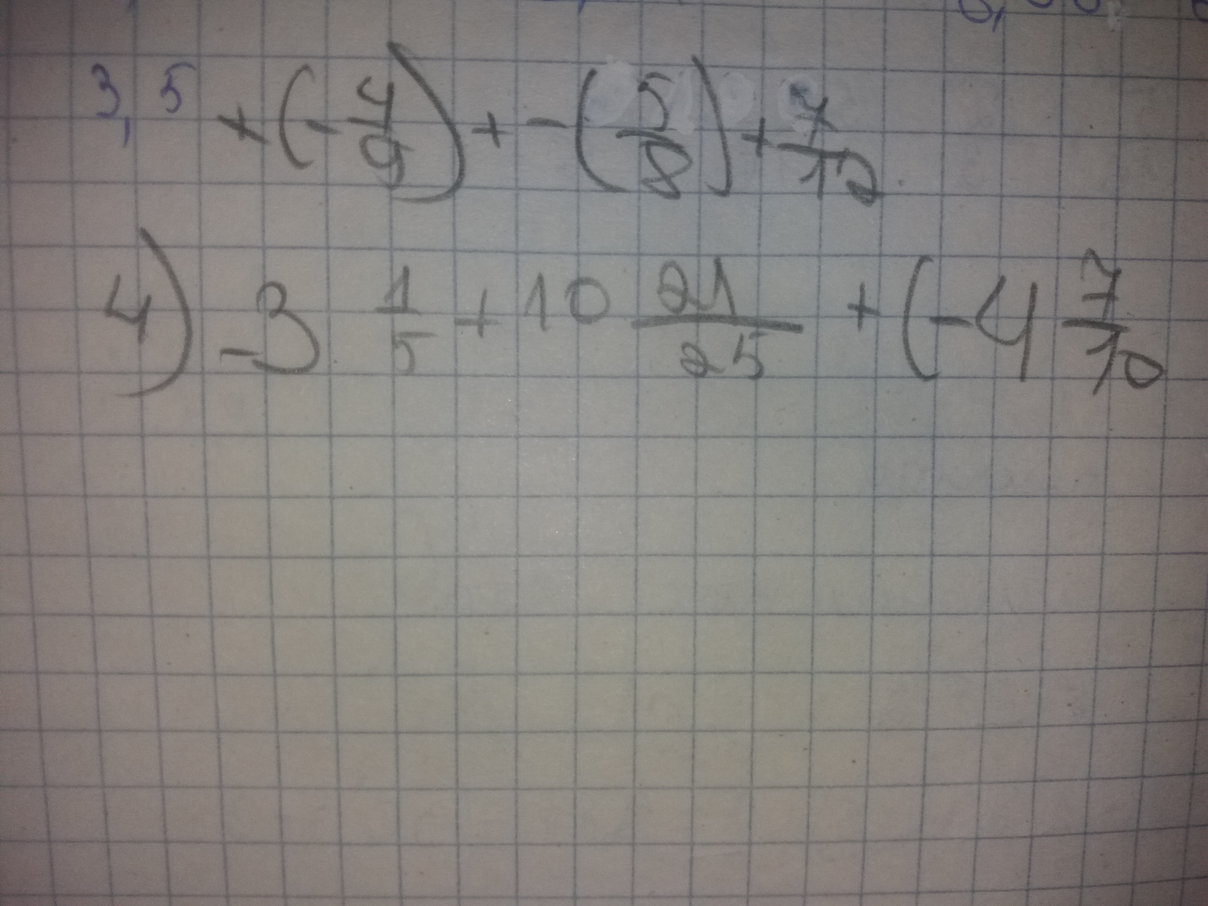 4. -3 1/5 + 10 21/25 + (-4 7/10) = -16/5 + 271/25 + (-47/10) = -160/50 + 542/50 + (-235/50) = 147/50 = 2 47/50