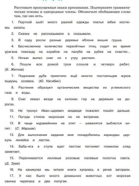 17) У нас было много домашних животных: кот, морская свинка, черепаха и два попугая. грамм. основа- было много животных, кот, морская свинка, черепаха, два попугая./// обобщ. слово- много животных