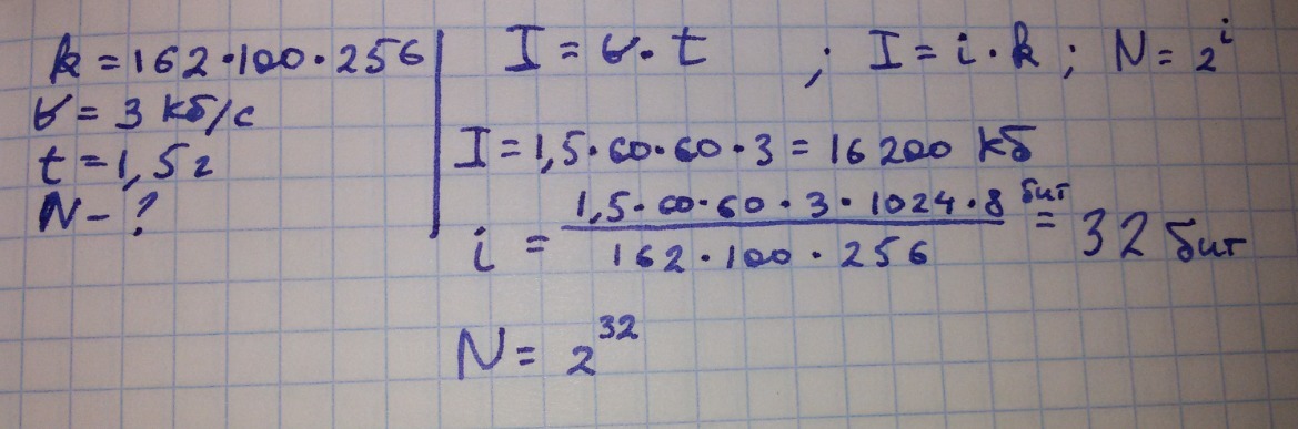 книга набранная с помощью компьютера содержит 162 странице на каждой странице 100 строк, в каждой строке 256 символ. определите мощность алфавита, если со скоростью 3 кб/с производилась передача 1.5 ч