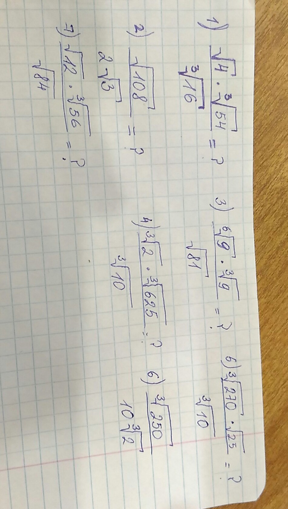 1) ![frac{ sqrt{4} * sqrt[3]{54} }{ sqrt[3]{16} }= frac{2 * sqrt[3]{2*3 ^{3} } }{ sqrt[3]{2 ^{4} } }= frac{2*3* sqrt[3]{2} }{2 sqrt[3]{2} }= 3 frac{ sqrt{4} * sqrt[3]{54} }{ sqrt[3]{16} }= frac{2 * sqrt[3]{2*3 ^{3} } }{ sqrt[3]{2 ^{4} } }= frac{2*3* sqrt[3]{2} }{2 sqrt[3]{2} }= 3](https://tex.z-dn.net/?f=+frac%7B+sqrt%7B4%7D+%2A++sqrt%5B3%5D%7B54%7D+%7D%7B+sqrt%5B3%5D%7B16%7D+%7D%3D+frac%7B2+%2A+sqrt%5B3%5D%7B2%2A3+%5E%7B3%7D+%7D+%7D%7B+sqrt%5B3%5D%7B2+%5E%7B4%7D+%7D+%7D%3D++frac%7B2%2A3%2A+sqrt%5B3%5D%7B2%7D+%7D%7B2+sqrt%5B3%5D%7B2%7D+%7D%3D+3++++)