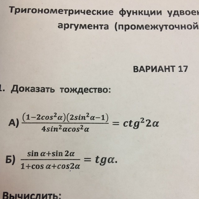 1-2cos^2a=cos^2a+sin^2a-2cos^2asin^2a-cos^2a= -cos2a; 2sin^2a-1=2sin^2a-sin^2a-cos^2a=sin^2a-cos^2a= -cos2a; 4sin^2acos^2a=(2sinacosa)^2=sin^2(2a). получаем: (-cos2a)*(-cos2a)/sin^2(2a)=cos^2(2a)/sin^2(2a)=ctg^2(2a).