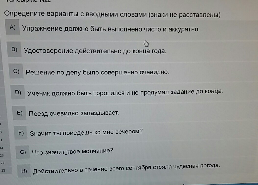 Д) Ученик, должно быть, торопился и ............. Е) Поезд, очевидно, запаздывает. Ф) Значит, ты приедешь..........? Н) Действительно, в течение всего сентября ................. Вот эти предложения с вводными словами, которые выдел. запятыми. А остальные предложения с разными частями речи, но запятых в них нет!