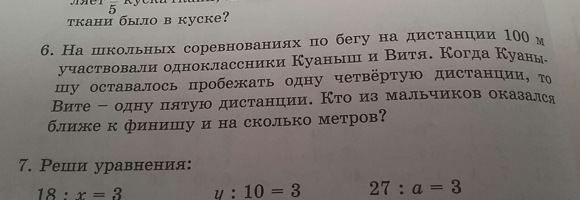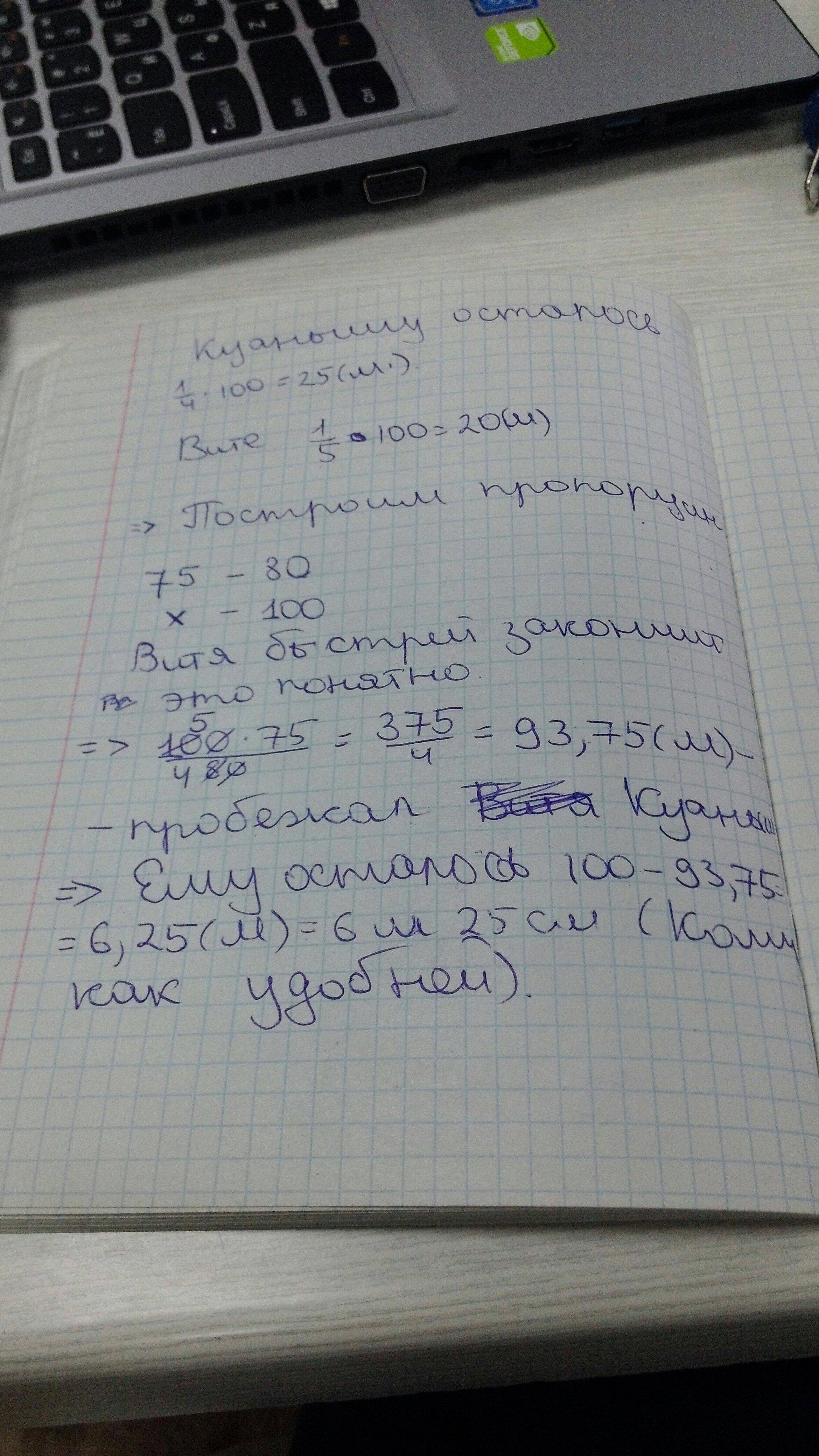 куаныш пробежал 25 метров а витя 20 метров куаныш больше к финишу на 5 метров