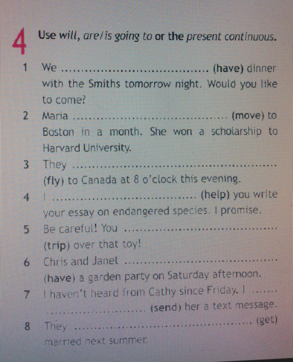 1. are having. 2.is moving 3. are flying .4. will help .5. are going to trip. 6. are having. 7. will send. 8. are going to get.