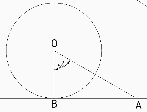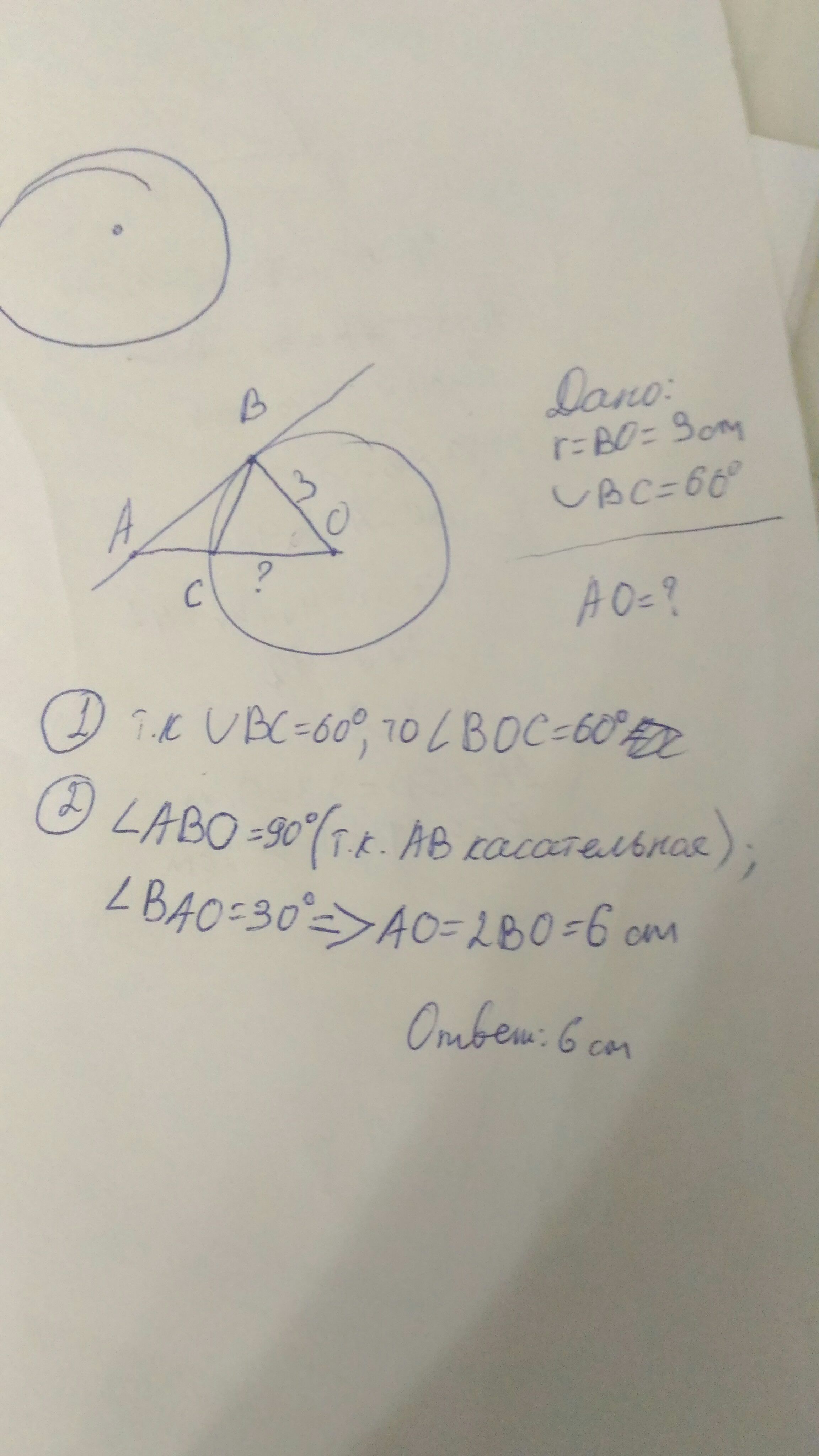 Прямая AB касается окружности с центром O в точке B. Найдите AO, если радиус окружности – 3 см, а хорда, один конец которой совпадает с точкой касания, а второй – с точкой пересечения окружности и прямой AO, стягивает дугу 60°.
