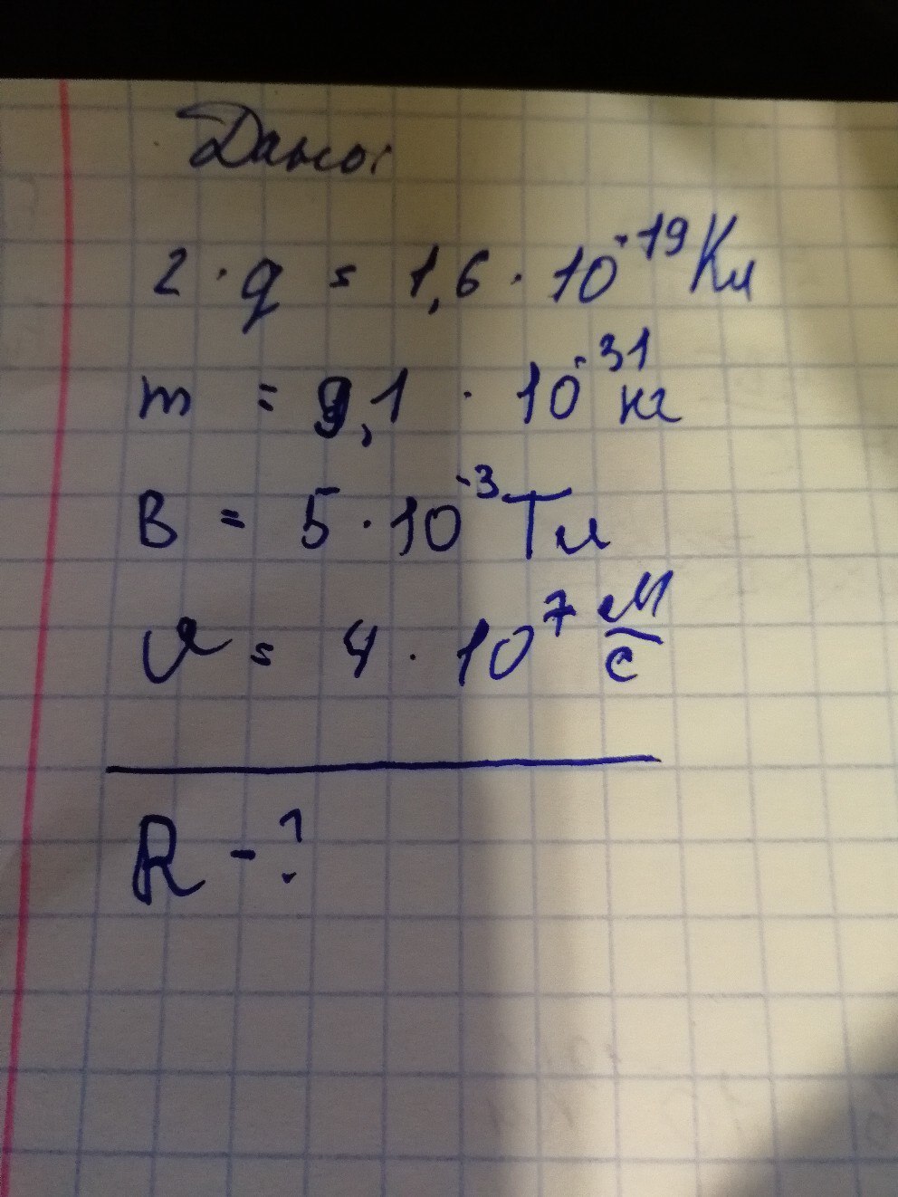 R=m*V/q*B=9,1*10^-31*4*10^7/1,6*10^-19*5*10^-3=4,55*10^-2 м