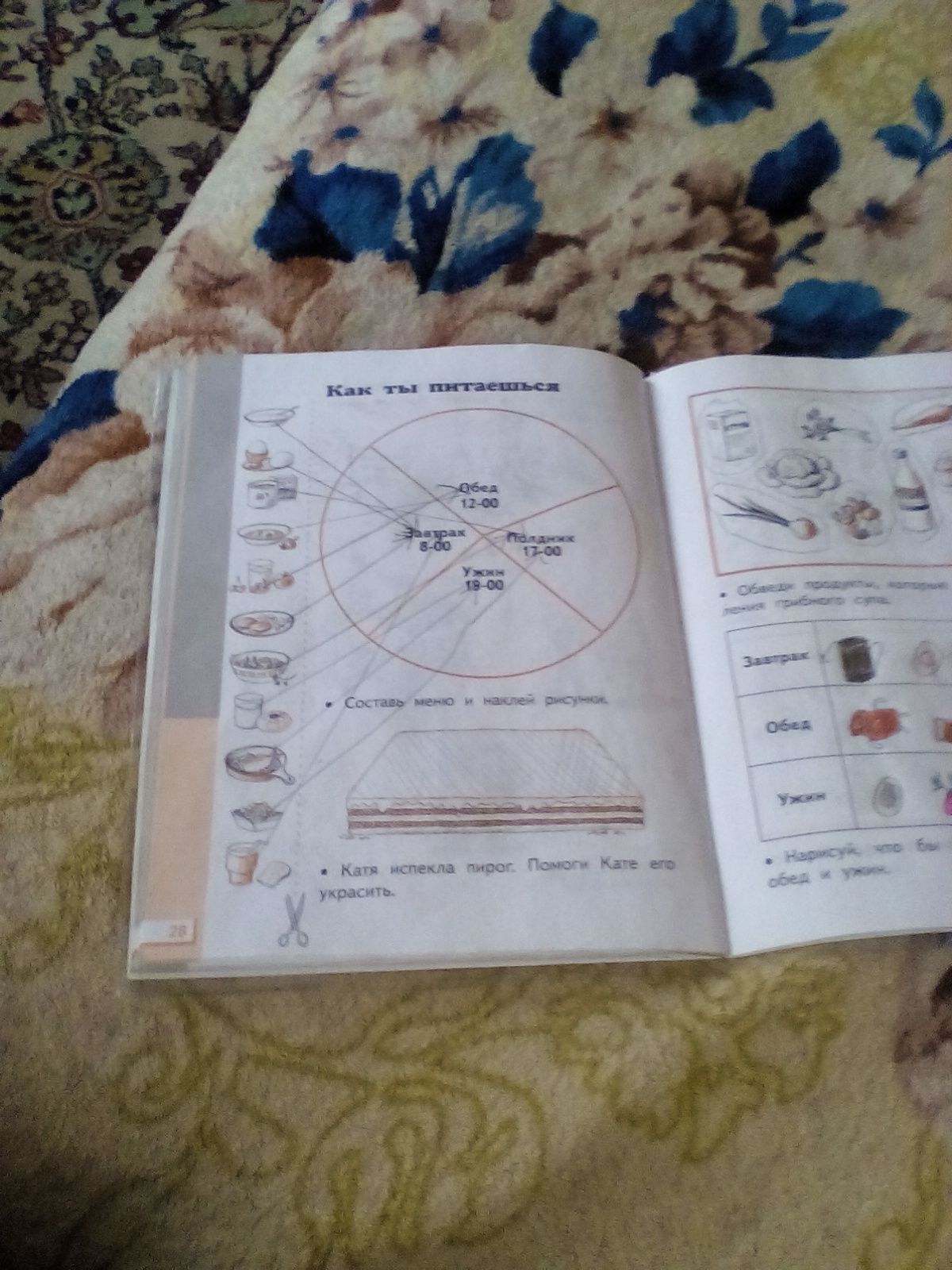 Как ты питаешься.Составь меню и клей рисунки.Катя испекла пирог.Помоги Кате его украсить.