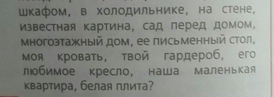 cupboard, in the fridge, on the wall, famous painting, Garden in front of the house, multi-story house, her desk, my bed, your wardrobe, his favorite chair, our little apartment, white plate?