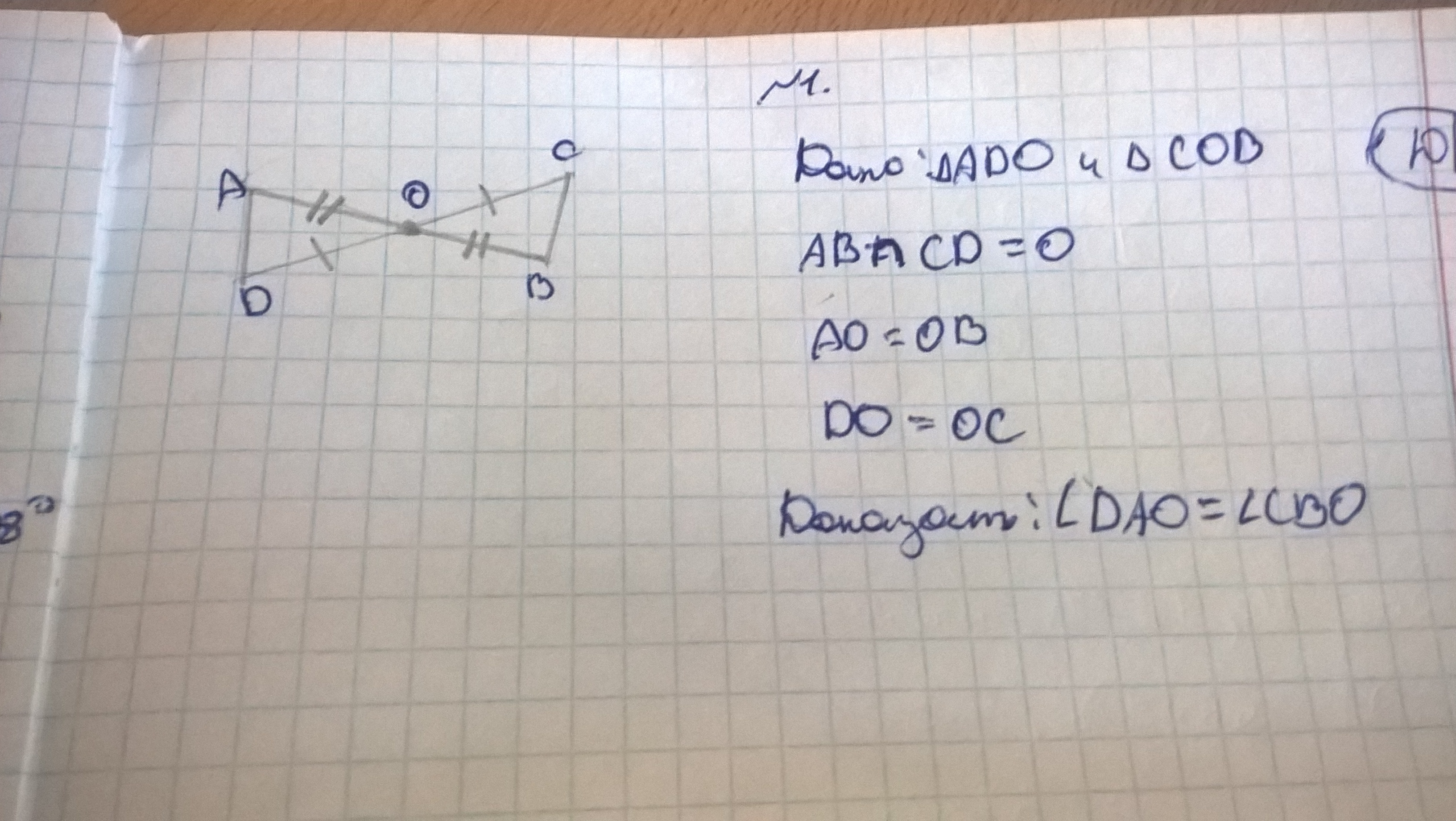 Здесь треугольники равны по первому признаку равенства треугольников. Две стороны равны по условию, углы между ними равны.