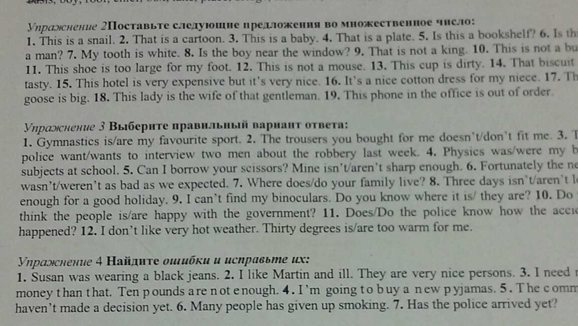 1. Susan was wearing a black jeans. 2. I like Martin and ill. They are very nice persons. 3. I need more money t han t hat. Ten p ounds a re n ot e nough. 4. I'm going t o b uy a n ew p yjamans. 5. T he c ommitte haven't made a decision yet. 6. Many people has given up smoking. 7. Has the police arrived yet?