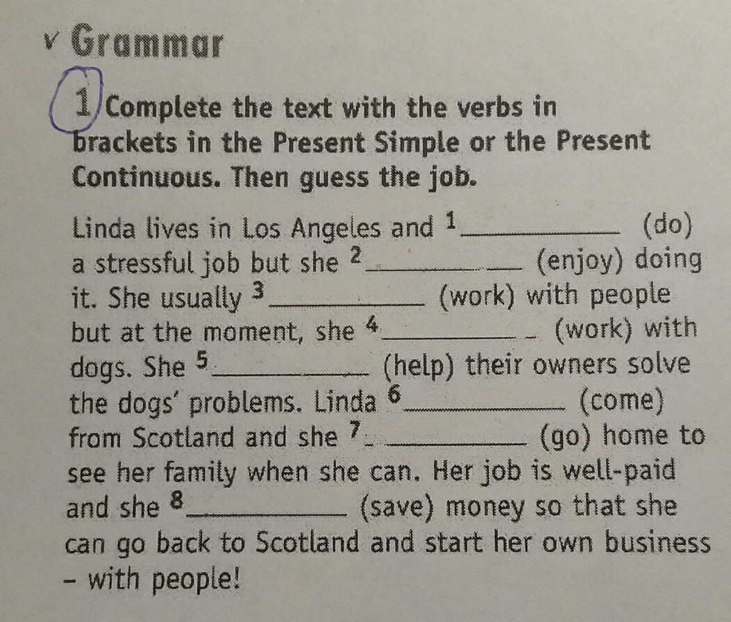 Linda lives in Los Angeles and does a stressful job but she enjoys doing it.She usually works with people but at the moment,she is working with dogs.She helps their owners solve the dogs' problems.Linda comes from Scotland and she goes gome to see her family when she can.Her job is well-paid and she saves money so that she can go back to Scotland and start her own business - with people! Перевод текста:Линда живет в Лос-Анджелесе и не напряженная работа, но она любит это делать.Она обычно работает с людьми, но на данный момент, она работает с собаками.Она помогает их владельцев собак проблемы.Линда приходит из Шотландии, и она идет gome, чтобы увидеть ее семью, когда она может.Ее работа высокооплачиваемая, и она экономит деньги, так что она может вернуться в Шотландию и начать свой собственный бизнес - с людьми!