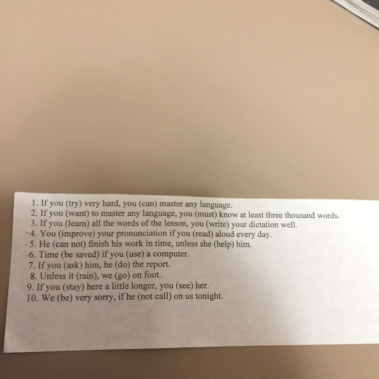 л. Если вы попытаетесь) очень сильно, вы можете (умеете) освоить любой язык. 2. Если вы (хотите) овладеть любым языком, вы (должны) знать не менее трех тысяч слов. 3. Если вы (учите) все слова урока, вы хорошо пишете свою диктовку. -4. Вы (улучшаете) свое произношение, если вы (читаете) вслух каждый день. 5. Он (не может) закончить свою работу вовремя, если только не помог ему. -6. Время (сохраняется), если вы используете компьютер. 7. Если вы (спросите) его, он (сделает) отчет. 8. Если он (дождь), мы (идем) пешком. 9. Если вы (останетесь) здесь немного дольше, вы (видите) ее 10. Мы очень сожалеем, если он (не звонит) сегодня вечером. 3AKPblTb
