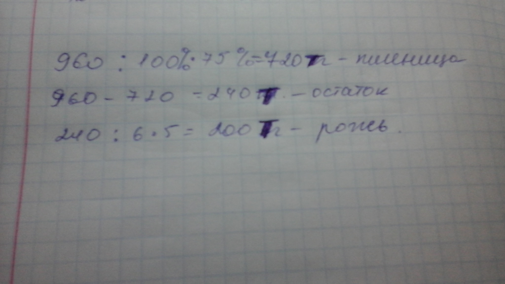 Фермерское хозяйство собрало 960 т зерна. 75% собранного зерна составляла пшеница, а 5/6 остатка - рожь, сколько тонн ржи собрало фермерское хозяйство?