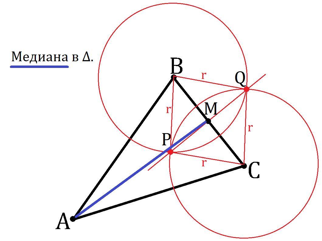 Медиана треугольника соединяет вершину треугольника и середину противоположной стороны, значит чтобы построить медиану нам нужно найти середину стороны. Пусть в ΔABC мы хотим провести медиану из вершины A на сторону BC, для этого: