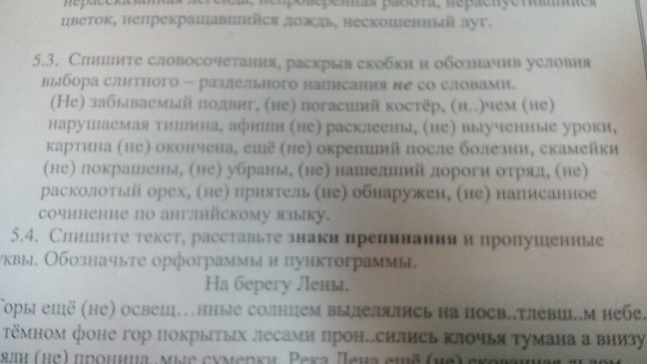 Не забываемый подвиг,не погасший огонь,(и..)чем не нарушаемая тишина,афиши не расклеены, не выученные уроки,картина не окончена, еще не окрепший после болезни,скамейки не покрашены,не убраны,ненашедший дороги отряд(в этом предложении не уверена ,посмотри в интернете), не расколотый орех,неприятель,не обнаружен,не написанное сочинение по английскому языку