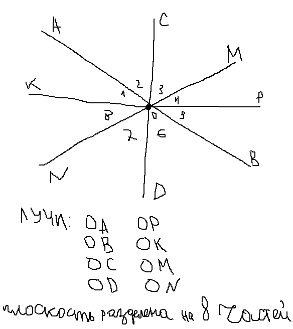 Начертите прямые AB,CD,MN и KP которые пересекаются в одной точке O .Назовите все лучи,полечившиеся на чертеже.На сколько AB,CD,MN и KP делят плоскость?