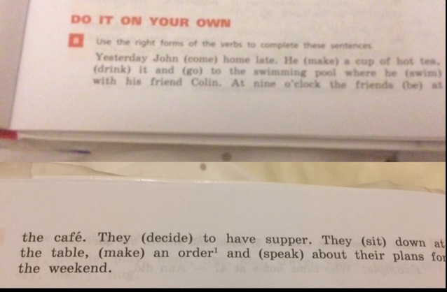 Yesterday John came home late. He made a cup of hot tea. Drank it and went to the swimming pool where he swam with his friends Colin . At nine o'clock the friends were at the cafe. They decided to have supper . They sat down at the table , made an order and spoke about their plans for the weekend.