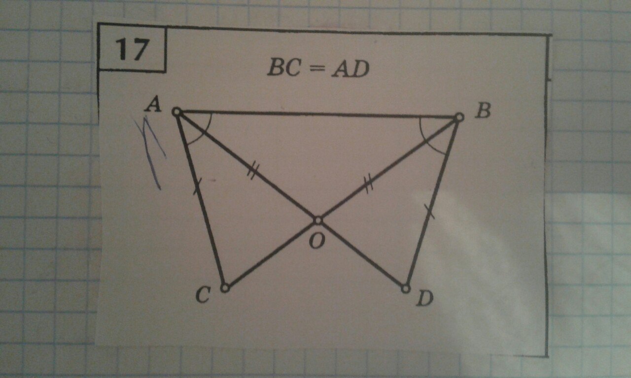 Ну смотри, 2 стороны и угол между ними, в первом треуголнике сторона АС и АО и угол А.Во втором треугольнике ОВ и ВD и угол б, они одинаковые, значит это и есть второй признак