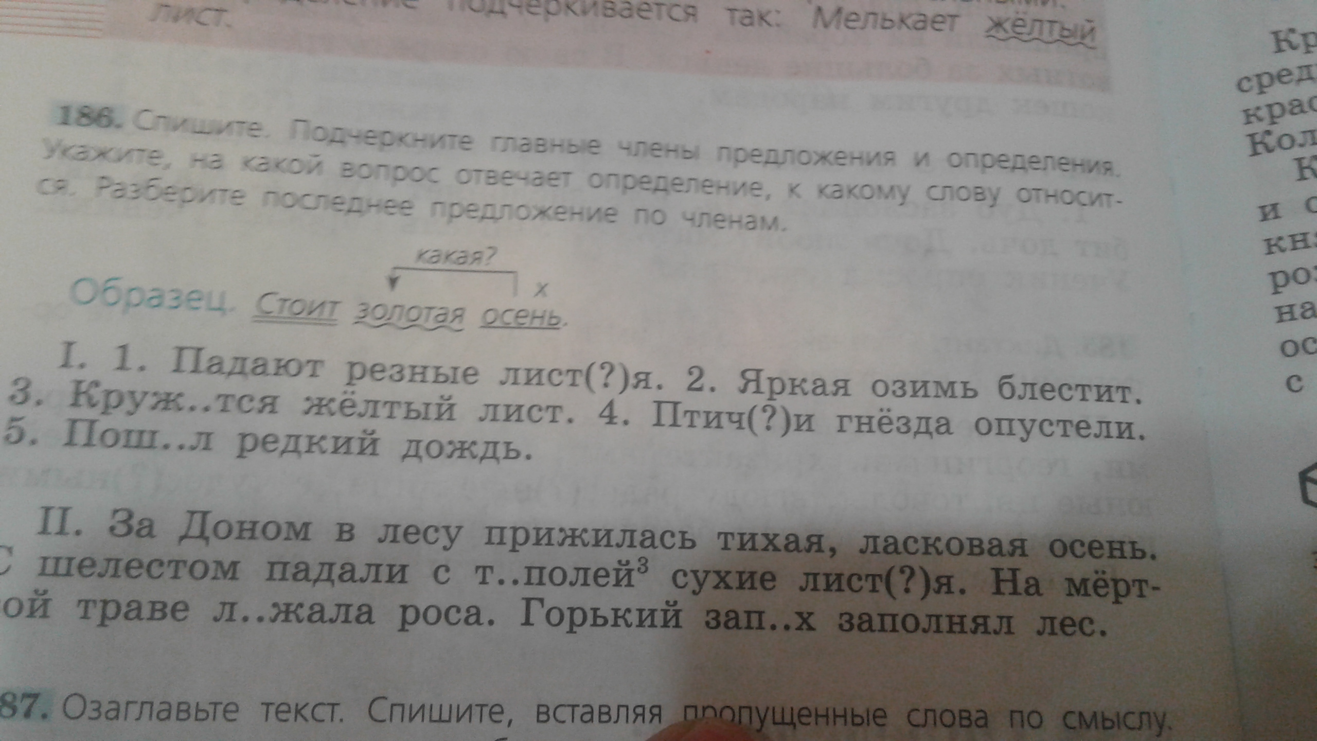 1.падают(глагол .двумя чертами подчеркиваем ) разные(какие? ) листья(подлежащее).2.яркая(какая?) озимь(полеж) блестит(гл) .3 кружится(Гл) желтый (какой?)лист.(ЧТО?)