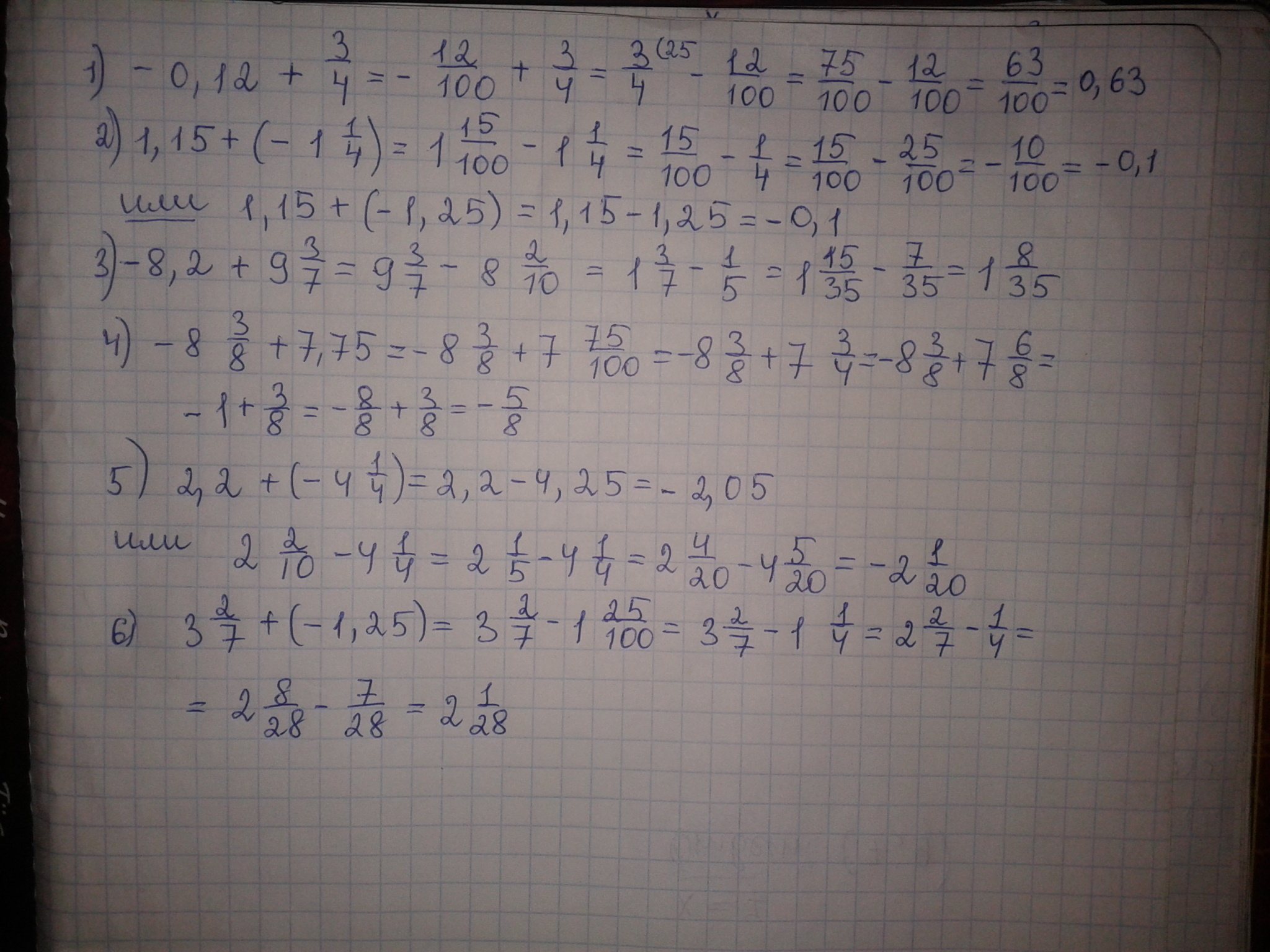 Вычилите:-0,12+3/4;1,15+(-1целых1/4); -8,2+9целых 3/7; -8целых 3/8+7,75; 2,2+(-4целых1/4); 3целых 2/7+(-1,25).Пожалустп помогите мне на завтра нужна и пожалуста решение напитка.