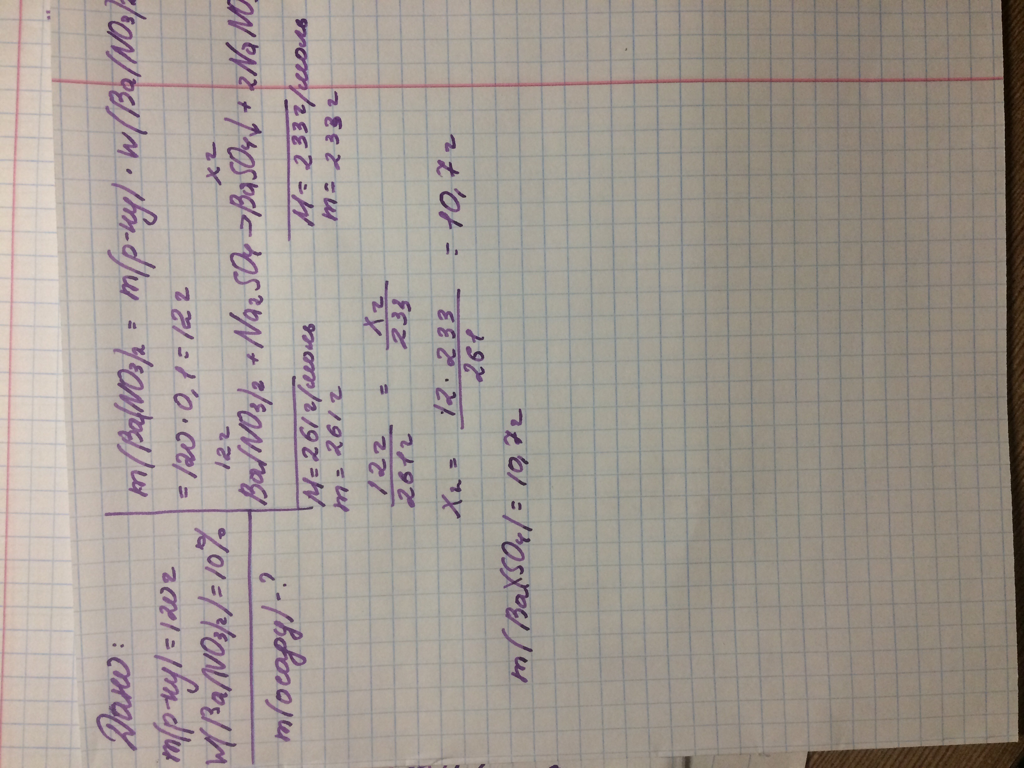 ОБЧИСЛІТЬ масу осаду одержаного в результаті змішування розчинів ba(no3)2 масою 120 г з масовою часткою 10% з натрій сульфатом