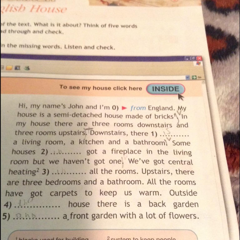 His name is John and he's from England. His house is a semi-detached house made of bricks. In his house three are three rooms downstairs and three upstairs. Downstairs,there is a kitchen,a living room and a bathroom.
