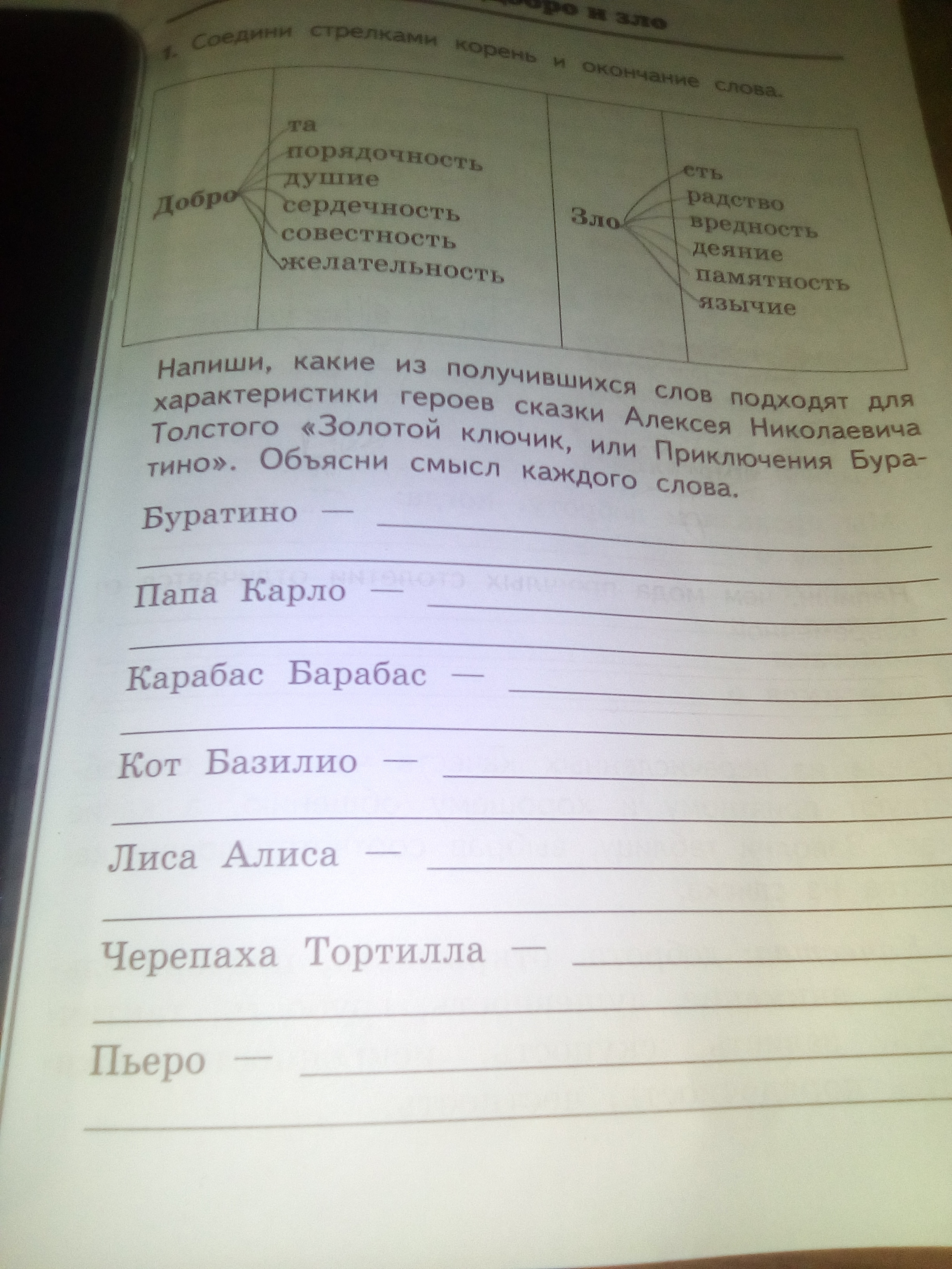 Напиши, какие из получившихся слов подходят для характеристики героев сказки Алексея Николаевича Толстого "Золотой ключик, или Приключения Буратино"