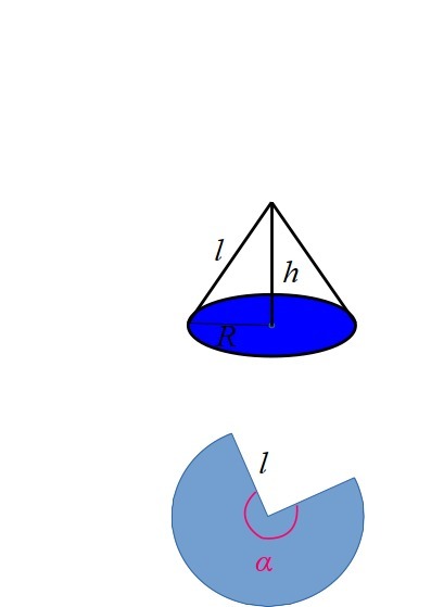 Как из развертки получится конус, думаю понятно. При этом радиус развертки будет образующей конуса l. А длина дуги развертки будет равна длине окружности основания. Находим образующую из теоремы Пифагора.