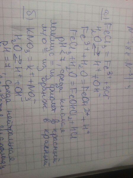 Составить уравнения гидролиза солей, указать среду раствора и цвет индикаторов а) КМnO4, б) FeCl3