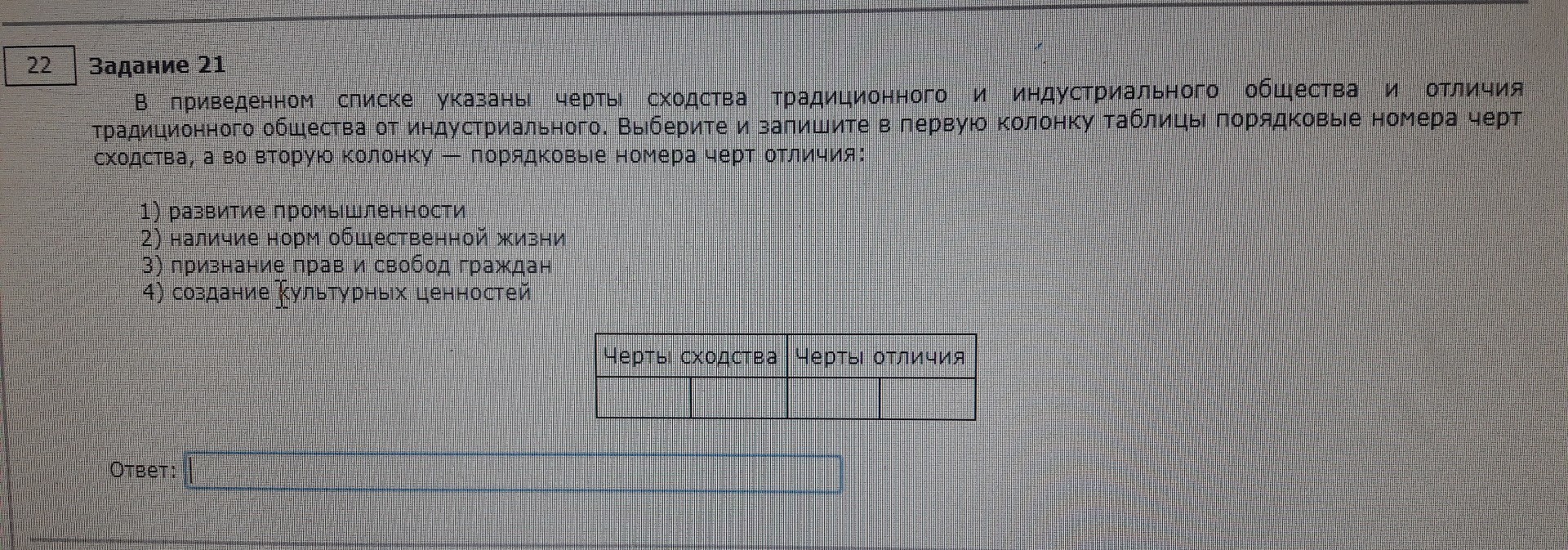 в приведенном списке указаны черты сходства традиционного и индустриального общества и отличия традиционного общества от индустриального. Выберете и запишите в первую колонку таблицы порядковые номера черт сходства, а во вторую колонку- порядковые номеоа черт отличия.1. развитие промышленности 2. наличие норм общественной жизни 3.признание прав и свобод граждан 4. создание культурных ценностей