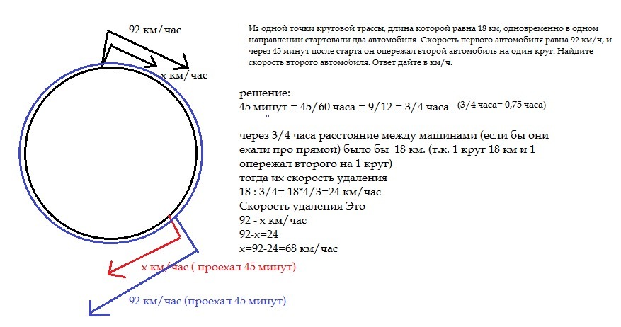Из одной точки круговой трассы, длина которой равна 18 км, одновременно в одном направлении стартовали два автомобиля. Скорость первого автомобиля равна 92 км/ч, и через 45 минут после старта он опережал второй автомобиль на один круг. Найдите скорость второго автомобиля