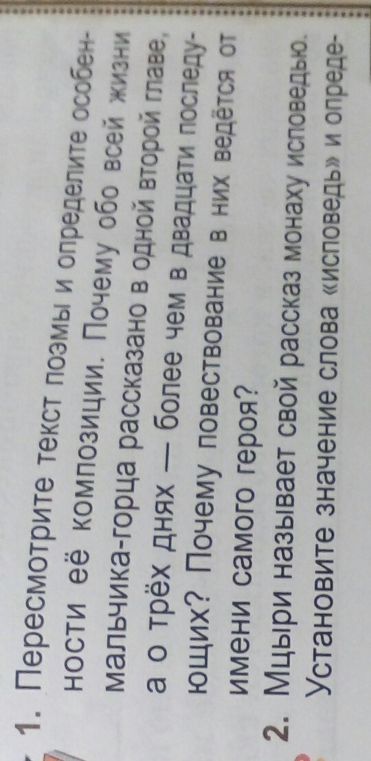Особенность композиции поэмы Лермонтова в том, что она состоит из 26-ти глав, две из которых - экспозиция, описание героя. 24 главы составляет рассказ Мцыри о трех днях, проведенных им на воле. Композиция монолога тоже подчинена задаче постепенного раскрытия его внутреннего мира.