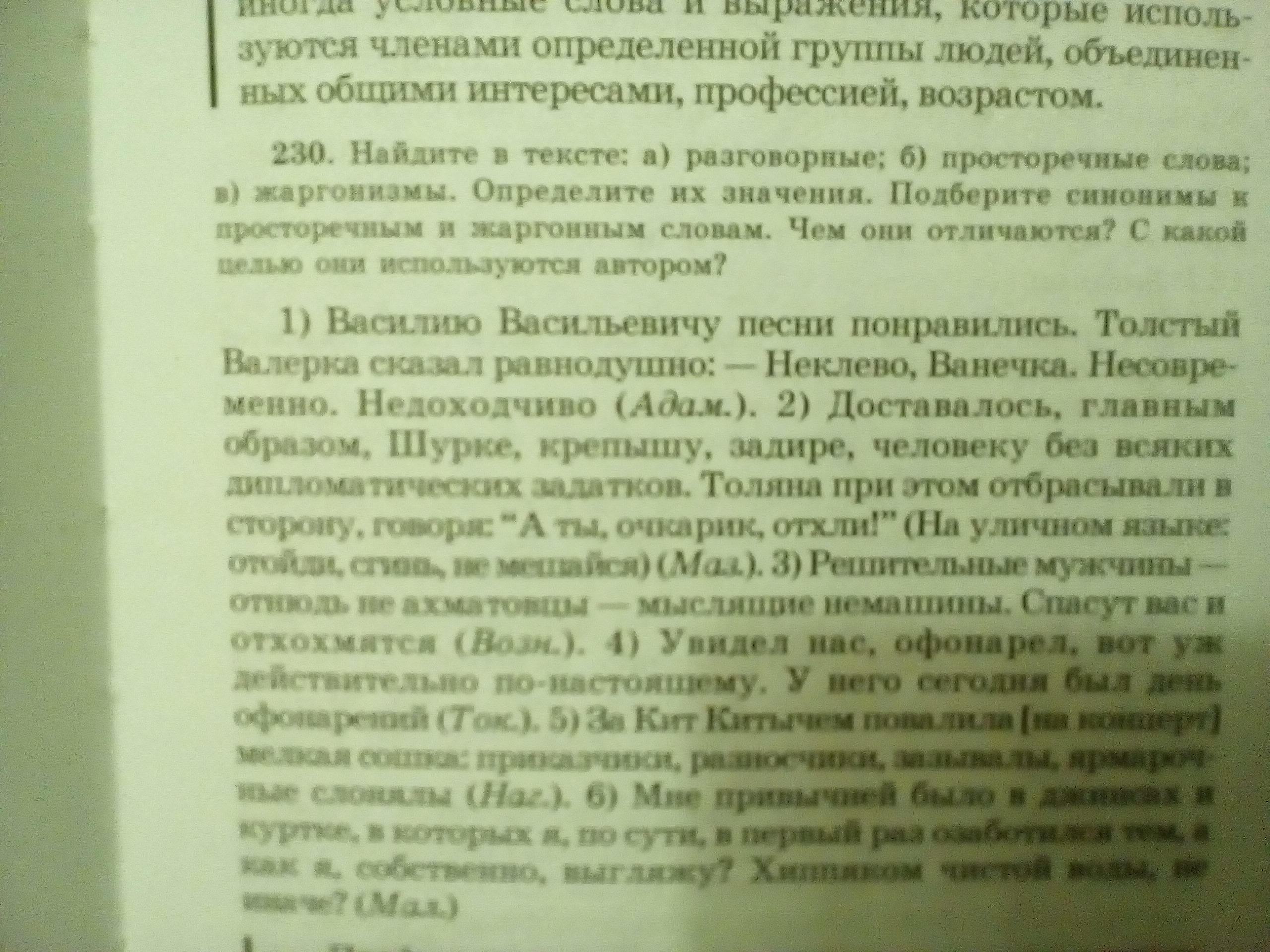 230. Найдите в тексте: а) разговорные; б) просторечные слова; в) жаргонизмы. Подберите синонимы к просторечные и жаргонным словам.
